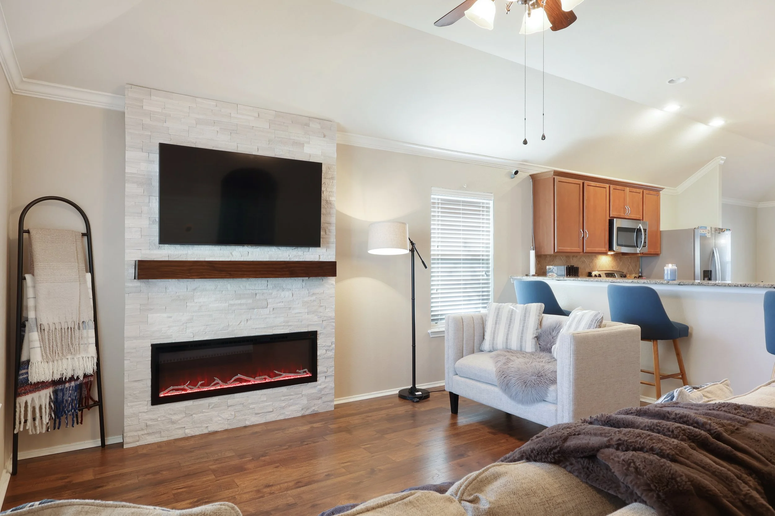 Step inside to stunning 18” tile flooring, refined crown molding, and ambient recessed lighting, creating a sophisticated yet inviting atmosphere. The living area is anchored by a striking electric fireplace with customizable mood lighting—ideal for cozy evenings or entertaining guests.